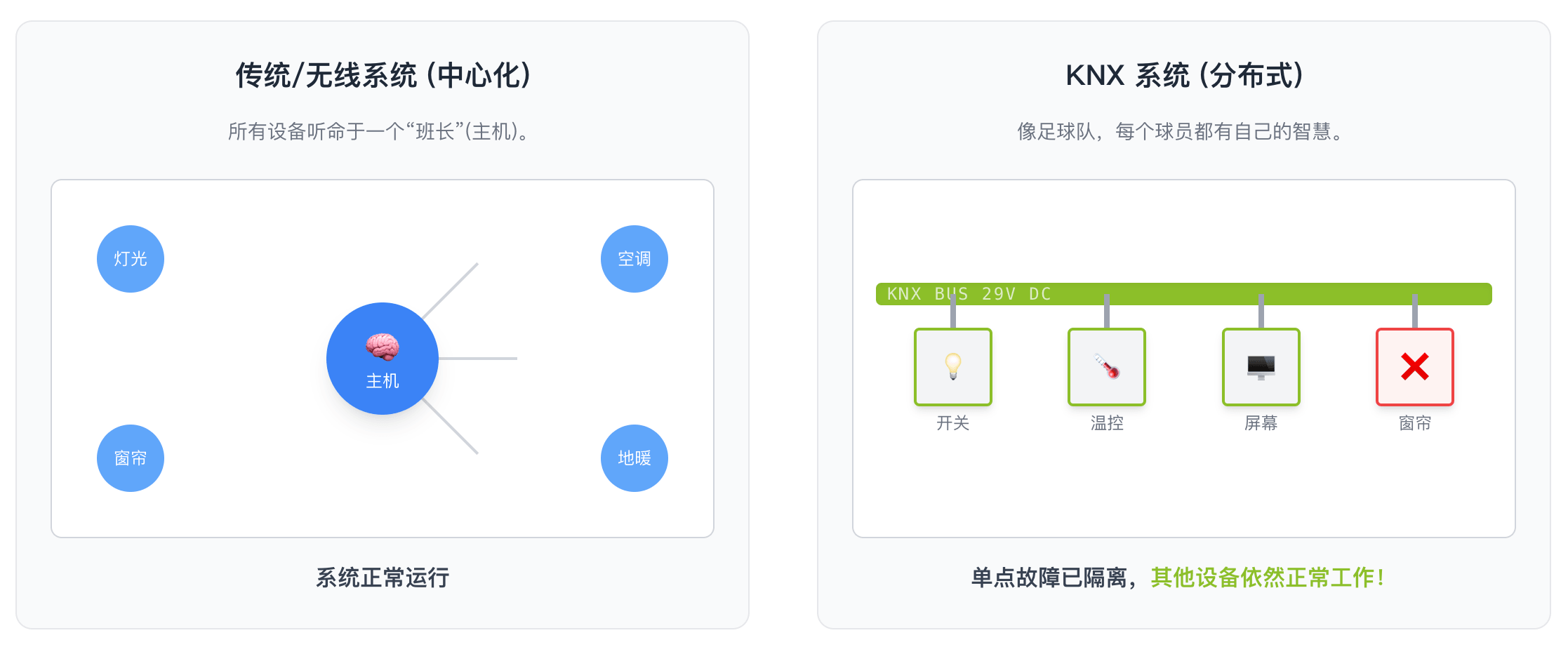 - KNX系统(分布式): 就像一个训练有素的足球队。每个球员(设备)都有自己的智慧。即使某个触摸屏坏了或者网络暂时中断,开关依然能控制灯光,空调也能继续调节温度。